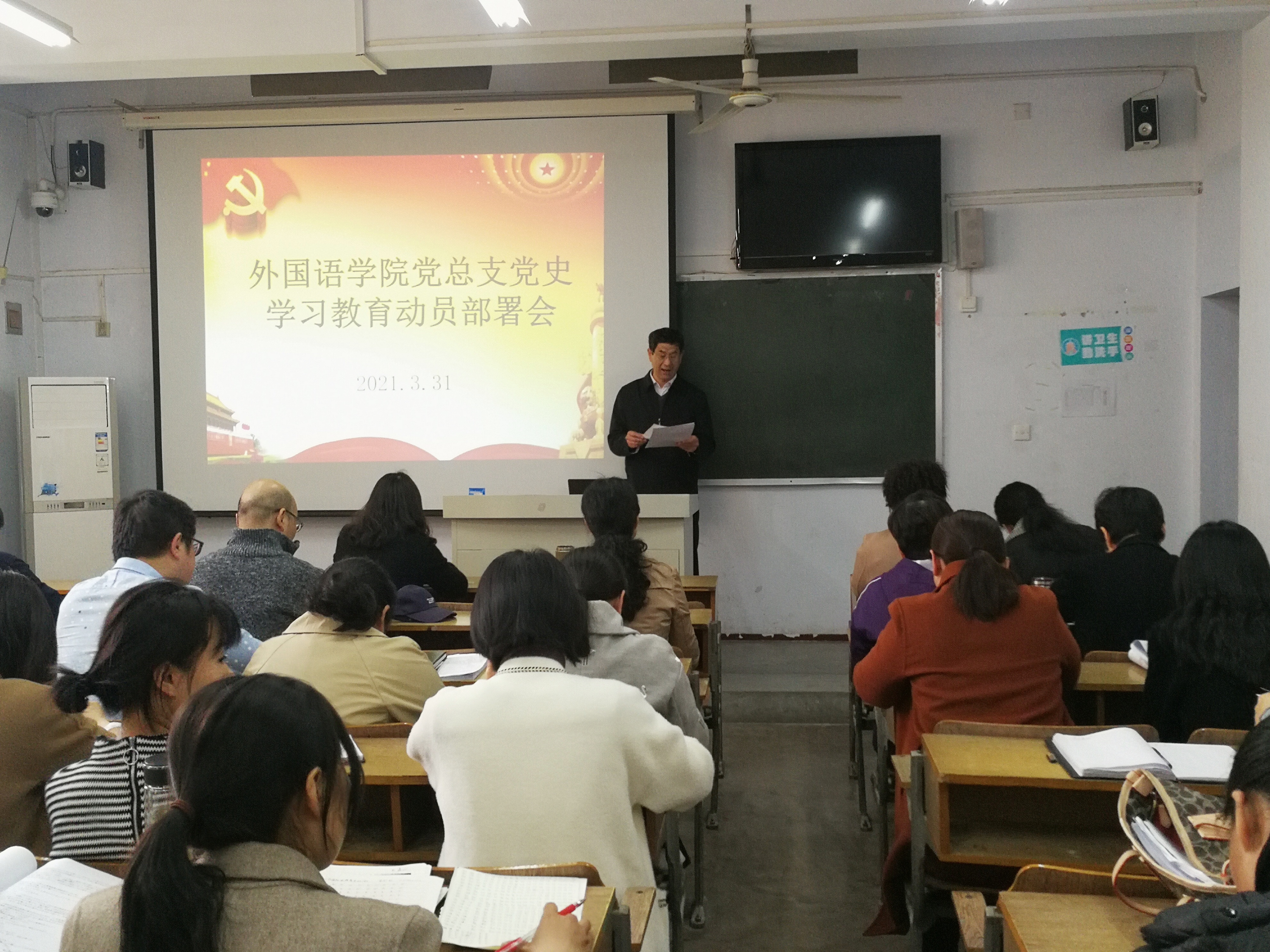 3月31日下午,BBIN宝盈集团官网首页在文科楼313教室召开党史学习教育动员大会,就学院党史学习教育进行部署安排,学院党政领导、全体教职工和学生党员参加会议。会议由学院院长韩建侠主持。