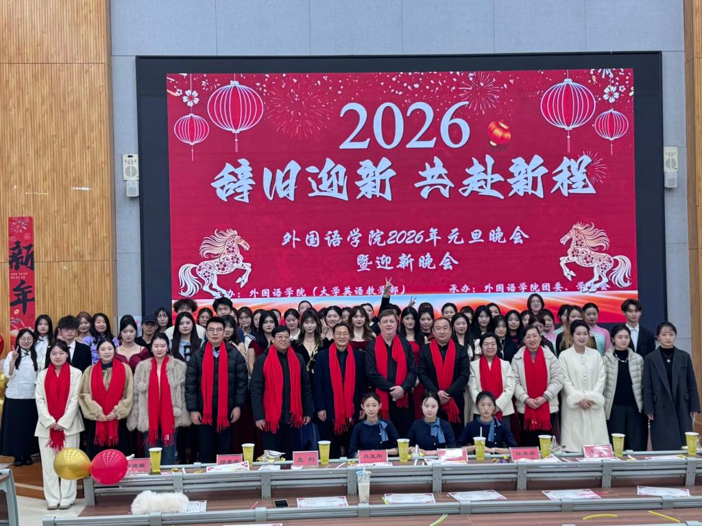 晚会前,学院党委书记滕聿峰做了热情洋溢的致辞,向全体师生致以最诚挚的新年祝福,回顾了学院一年来在党建引领、教学科研、团学建设、人才培养、社会实践等方面取得的丰硕成果,肯定了全体师生凝心聚力、笃行实干的奋进姿态,勉励外院学子以语言为桥、融通中外,在新的一年里不负韶华、逐梦前行,在青春赛道上跑出更好成绩。