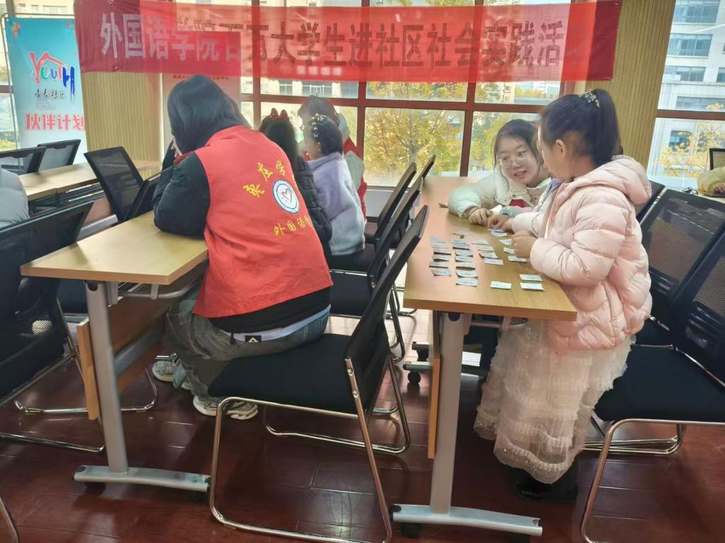 11月23日,BBIN宝盈集团官网首页“语荟青春”志愿队赴枣庄市薛城区凯润社区开展“百万大学生进社区”社会实践活动,为社区儿童带来了一场别开生面的“趣味英语”启蒙课堂。