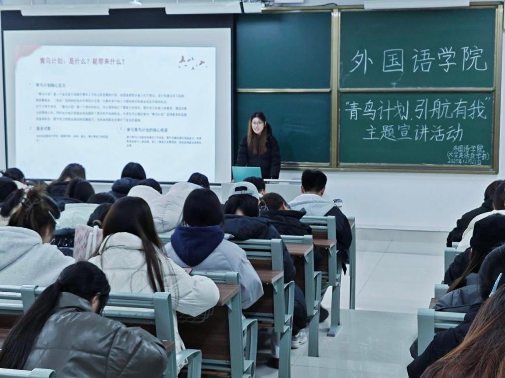 宣讲会上,学院团委负责人详细解读青鸟计划的政策支持,着重强调青鸟计划对外语专业学子发挥语言优势、投身基层建设、实现精准就业的重要意义,鼓励同学们以青鸟计划为纽带,把专业所长与家乡发展、社会需求紧密结合,在实践中锤炼本领、增长才干。学生代表结合自身参与青鸟计划的实践经历,分享了在社区外语志愿服务、跨境电商实习、乡村振兴外语帮扶等岗位的成长故事,从岗位适配、能力提升、跨文化沟通技巧等方面为学弟学妹传授实用经验。